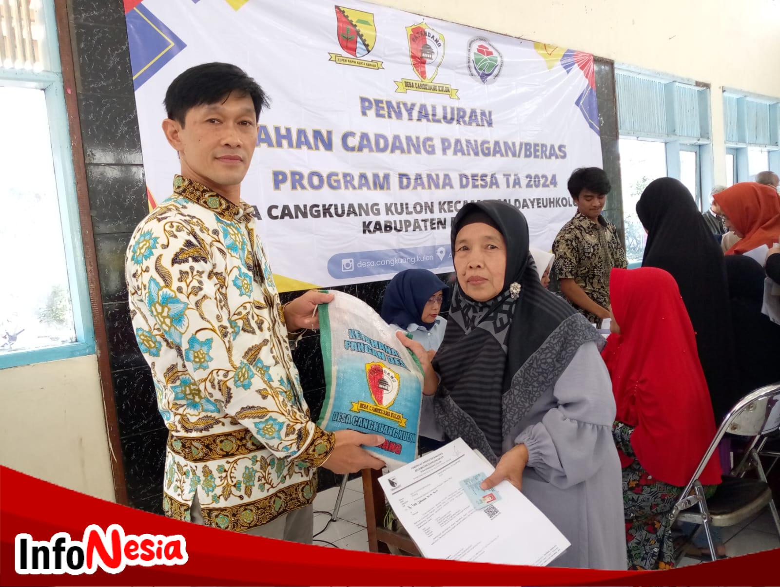 Sekdes Cangkuang Kulon Gun gun Menyerahkan Langsung Bantuan Pangan Beras 5 kg Pada 1068 KK di Desa Cangkuang Kulon.